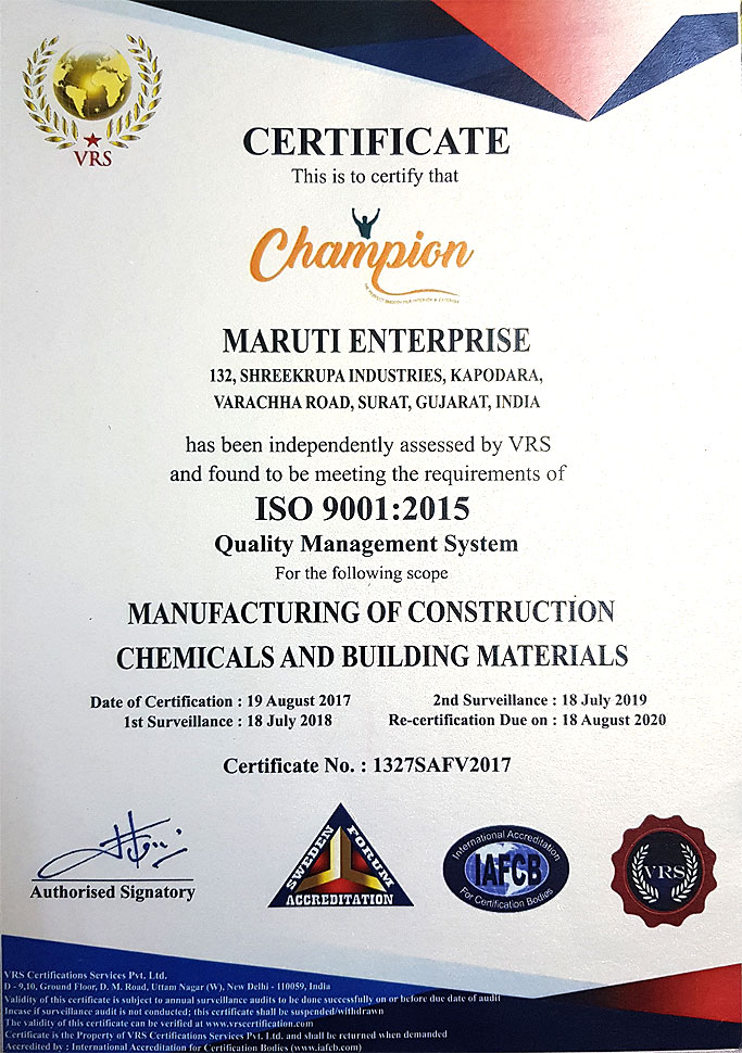 Champion Construction Chemicals is an ISO 9001:2015 Certified Construction Chemicals manufacturing company in Gujarat, India.